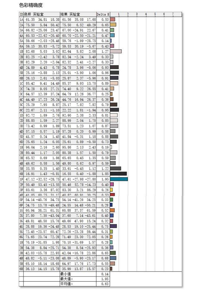 继续看色准表现,官方给出的数据是△E≤2,用校色仪测试的△E最大值为1.95,最小值为0.14,平均值为0.63,与官方标称值一致,平时做设计、剪辑也没啥问题。