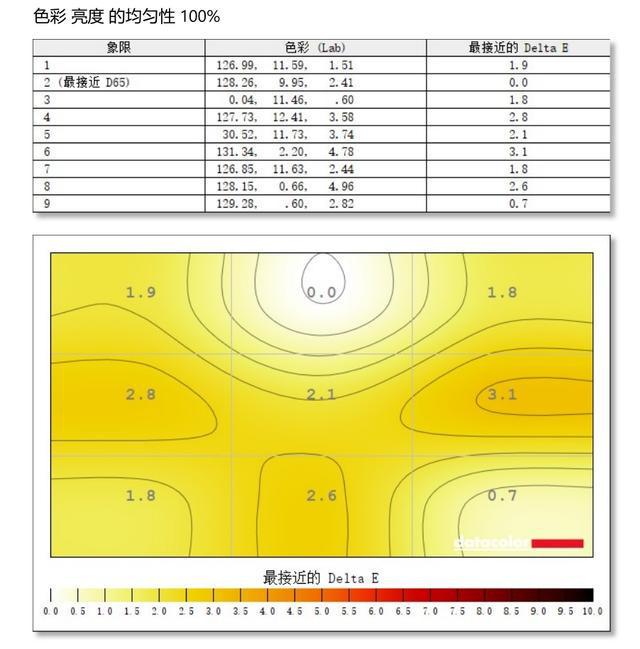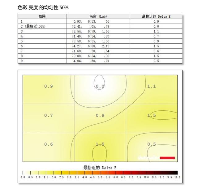 首先看看亮度50%时的屏幕均匀性表现。最接近△E也就是色差最小的区域为第二象限,采样部分甚至差值达到0,其他几个象限色差值也没超过1.5,已经很优秀了。另外显示器本身亮度就挺高,平时使用亮度调到50%也会比较舒适。