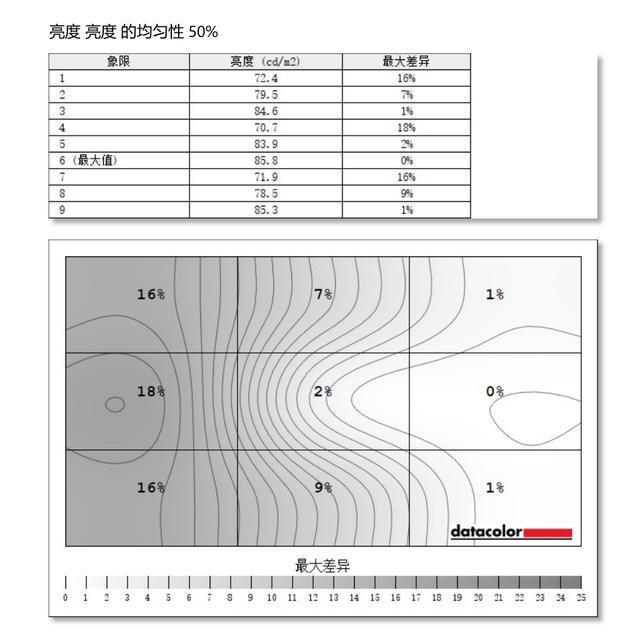亮度均匀性测试原理与色彩均匀性一样,灰域代表着该区域的亮度值与标准亮度值的差值,灰色越深,代表亮度差异越大。