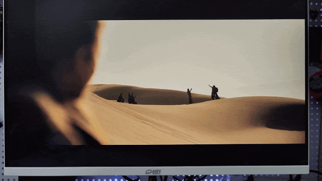 《沙丘2》电源截取片段,手机录制视频转GIF。看过的人应该都知道这部电影画面风格偏暗,在观影的时候对显示器的亮度要求还蛮高,用川升CS27X观看还是可以把影片的细节还原出来。